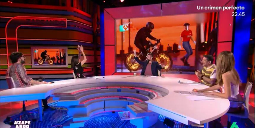 Las carcajadas no tardaron en aparecer al ver a Dani Mateo subido en una bicicleta cuyos radios de las ruedas estaban en llamas, avanzando lentamente mientras atravesaba cinco puertas de cristal. Nacho García intentó justificar la lentitud del presentador señalando que "no era fácil", aunque después no pudo evitar añadir con ironía: "Le quitaron los ruedines a la bicicleta", de ahí que fuese tan lento bromea el zapeador.