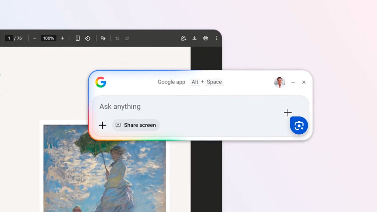 Existe un atajo para abrir la app, que es pulsar Alt y la tecla Espacio. Pero sin duda hay una función que nos parece bastante interesante, y es la capacidad para poder compartir la pantalla de nuestro PC. Junto al botón para añadir archivos tenemos uno para compartir la pantalla de nuestro ordenador. Para hacer cualquier búsqueda relacionada con ella, una vez pulsamos, podemos elegir compartir la pantalla completa, o bien determinadas aplicaciones o carpetas.