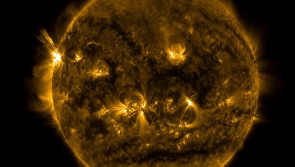 Unos minutos después de la media noche (hora española) del 5 de mayo, el sol lanzaba una potente llamarada que capturaban los instrumentos del Observatorio de Dinámica Solar de la NASA. Los satélites de la agencia estadounidense grababan el momento, en el que los diferentes colores indican las distintas longitudes de ondas de la radiación emitida.