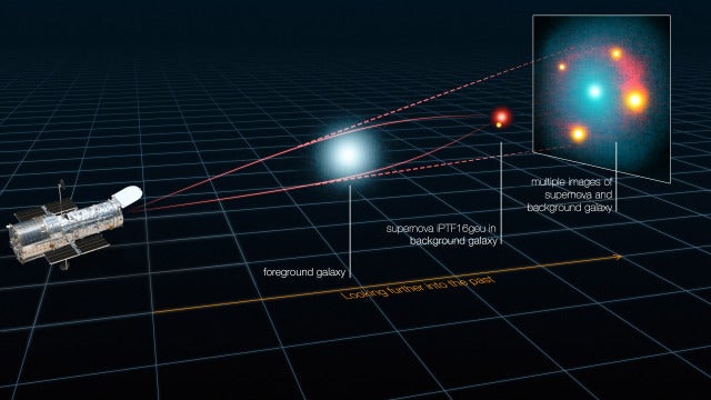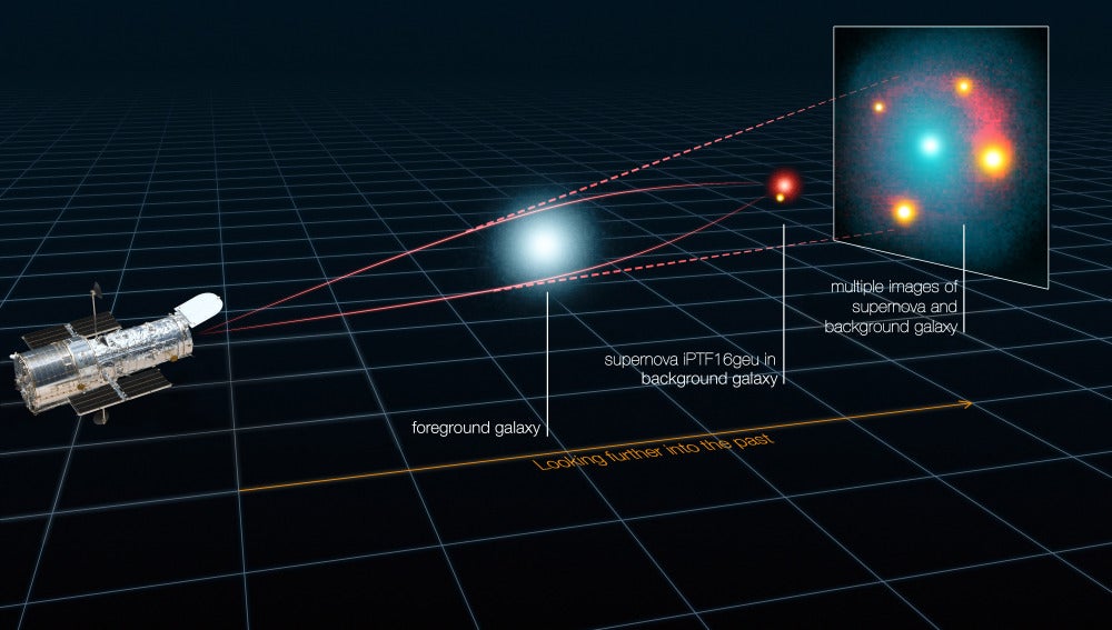 Así, una galaxia se colocó perfectamente alineada entre la Tierra y una supernova distante llamada iPTF16geu, lo que produjo que la luz de la fuente fuera dividida en cuatro pequeñas imágenes.