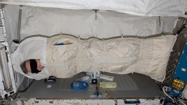 Llega la hora de dormir. Abstenerse claustrofóbicos. Olvídate de tirar un colchón al suelo. No hay colchón y no hay suelo, no hay arriba ni abajo. Con 16 puestas de Sol y amaneceres cada 24 horas es complicado saber cuándo dormir. Por eso los tripulantes tienen sus propios horarios y turnos. En realidad el astronauta puede dormir en cualquier sitio si es capaz de controlar sus movimientos e inercias. Lo normal es usar un saco atado a la pared donde poder controlar la flotación de extremidades. La ISS cuenta con cabinas dormitorio insonorizadas, con un ordenador, una lamparita y muy bien ventiladas para reciclar el propio dióxido de carbono generado.