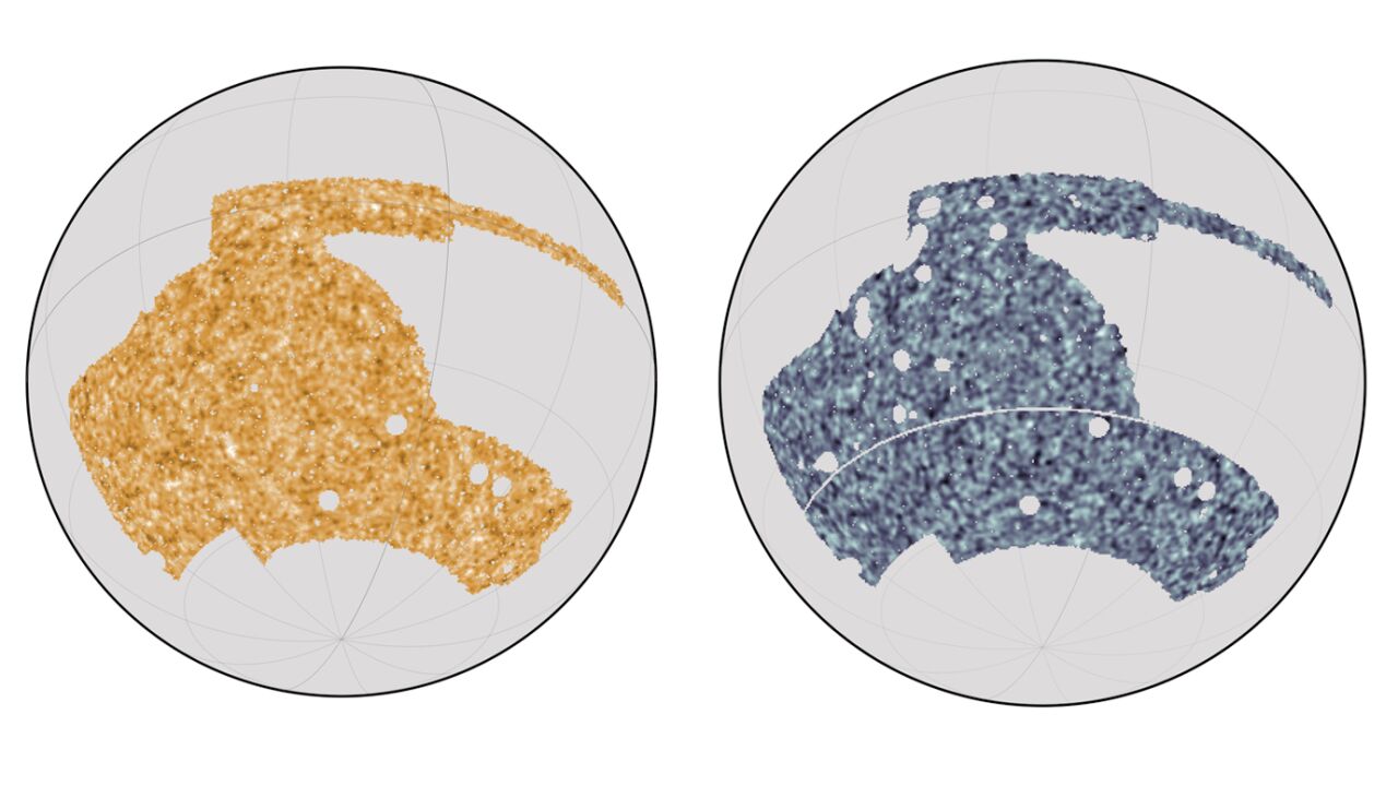 Tal y como se ve en la imagen superior, al comparar los mapas del cielo del telescopio Dark Energy Survey (a la izquierda) con datos del Telescopio del Polo Sur y el satélite Planck (a la derecha) el equipo pudo conocer más acerca de cómo se distribuye la materia en el universo.