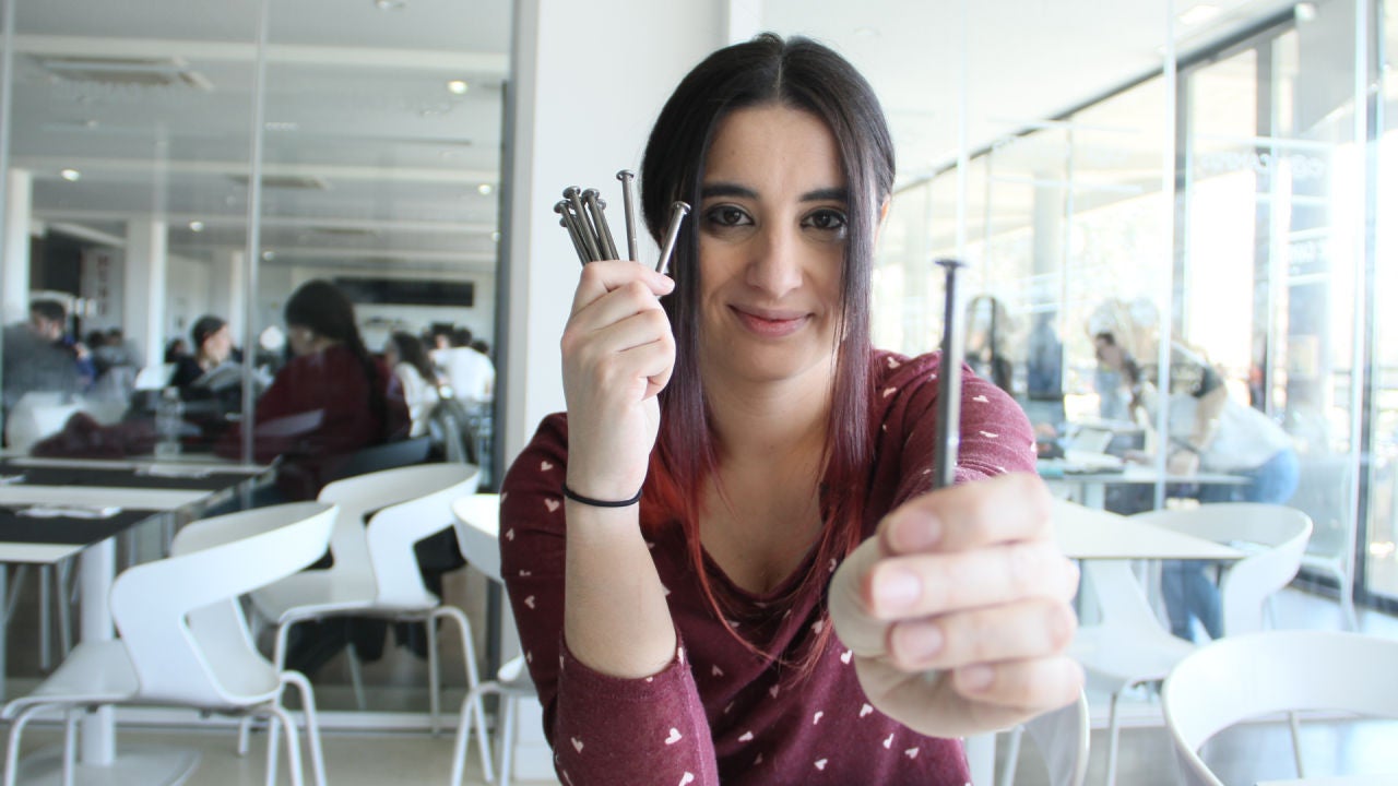 El truco consiste en poner un primer clavo como guía e ir contrapeando siete clavos encima. Luego, colocas otro para afianzar todo el sistema y lo levantas.