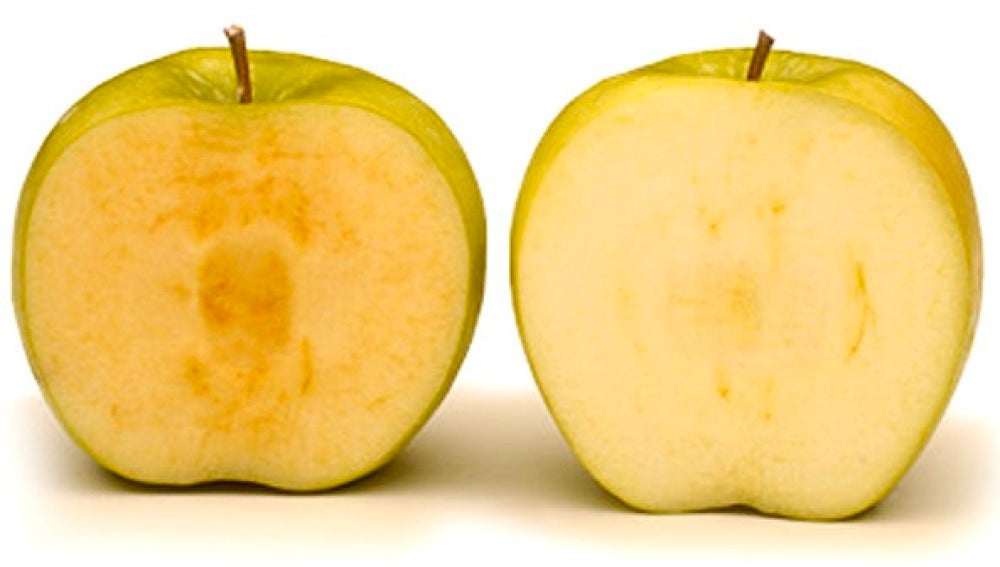 Esta manzana modificada genéticamente ha sido desarrollada durante dos décadas para que su interior no adquiera ese color marrón cuando se parte.