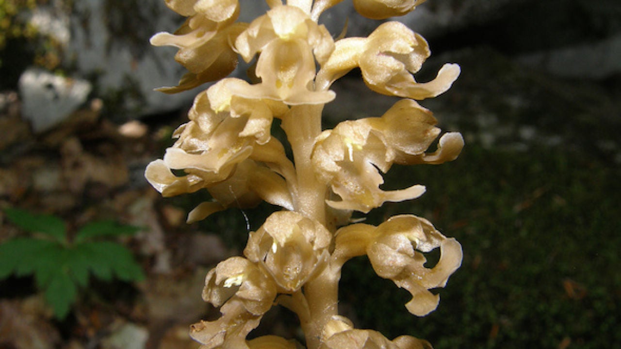 Buscando entre estas “plantas blancas” encontramos por ejemplo una curiosa orquídea presente en muchos hayedos cuyo nombre científico es Neottia nidus-avis. Al contrario que otras especies de su familia, los colores llamativos de sus flores y el verde de sus hojas son sustituidos por un anodino marrón pálido. Esta orquídea establece una relación (quizá un tanto aprovechada o quizá no, esto no está muy claro) con un hongo del suelo que se encarga de asimilar materia orgánica en descomposición y en convertirla en alimento para él y para la orquídea.