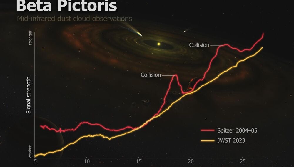 El equipo de Christine Chen, astrónoma de la Johns Hopkins, detectó cambios significativos en las firmas de energía emitidas por los granos de polvo alrededor de la estrella Beta Pictoris comparando los nuevos datos del James Webb con las observaciones realizadas por el telescopio espacial Spitzer en 2004 y 2005.