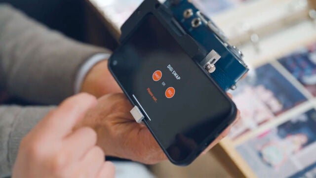 Como decimos, ha habido muchas soluciones para digitalizar lo analógico, desde los escáneres caseros de negativos, hasta las cámaras digitales con impresoras instantáneas integradas. Pero este dispositivo que ha llegado a la plataforma de crowdfunding convierte de verdad una cámara analógica a digital. Y lo mejor de todo, lo hace aprovechando sus lentes tal y como si se tratara de una cámara analógica. Este accesorio se adapta a los iPhone, y se puede colocar en el interior de la cámara, ocupando el espacio en el que se encontraría la película del carrete.
