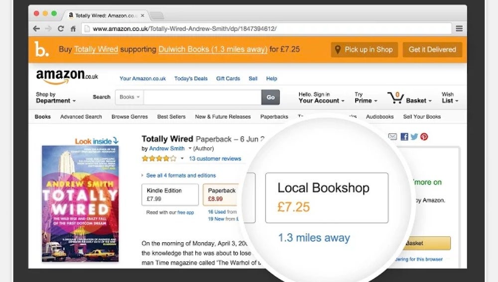 La segunda es que cualquier consumidor que entra en la tienda online de Jeff Bezos en busca de una novela, también puede cambiar de opinión y comprar en una librería de su barrio (solo en el Reino Unido). Si allí no tuvieran el libro más barato, esa diferencia puede considerarla abonada en concepto de apoyo al comercio local.