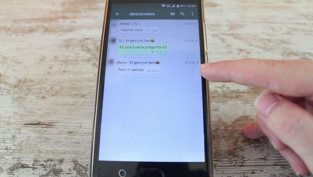 Abre la aplicación y busca un mensaje que quieras destacar. Cuando llegues al mensaje importante que quieras tener a buen recaudo selecciónalo pulsando en él hasta que cambie de color. Ahora pulsa en la estrella que aparece en la parte superior central de la pantalla. Al hacerlo verás que en el mensaje ha aparecido una estrella. Recuerda que puedes destacar mensajes tanto tuyos como los de tus amigos.