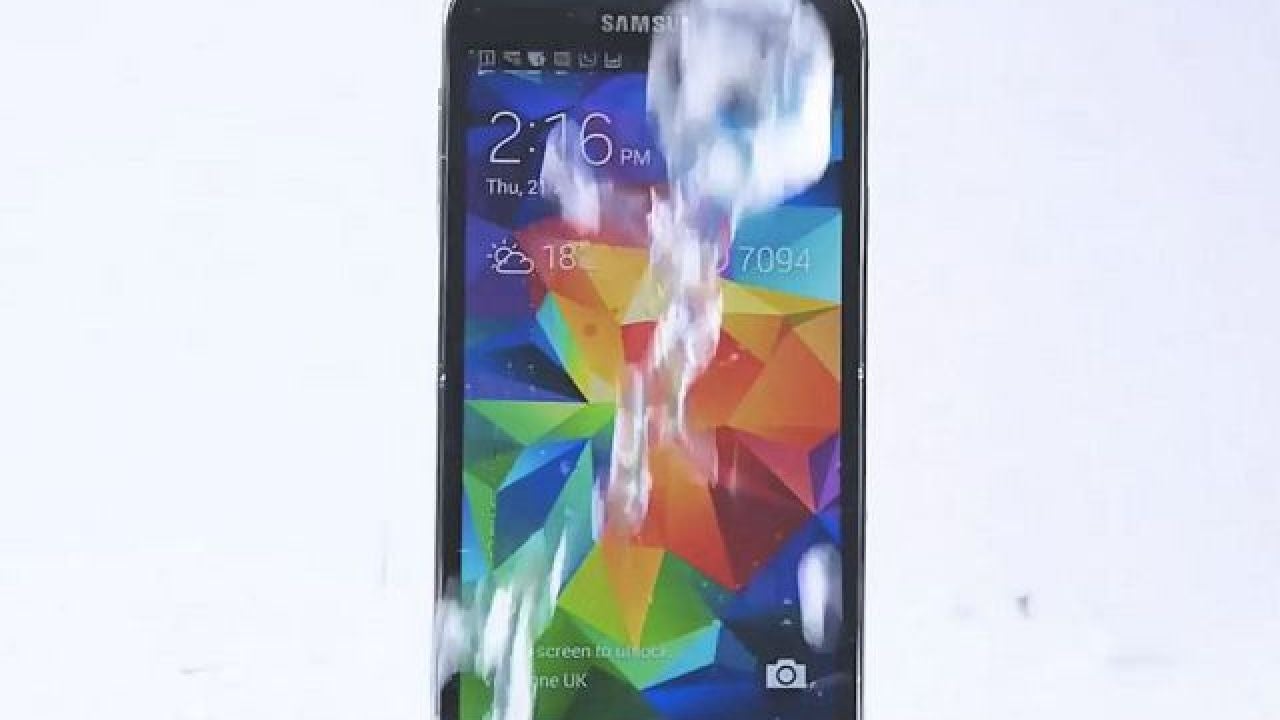 En un vídeo de 15 segundos, el Galaxy S5 se moja con agua helada y reta al iPhone 5S, al HTC One M8 y al Nokia Lumia 930 a que hagan lo mismo.