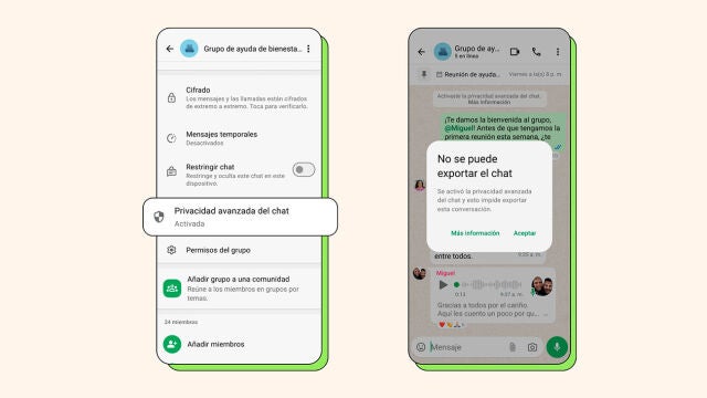 De esta forma, en esos chats que compartimos con centenares de personas, como por ejemplo el de la comunidad de vecinos, padres del cole y otros similares, donde no conocemos completamente a los participantes, nuestros mensajes o archivos adjuntos no podrán salir de sus dispositivos al menos a través de los medios habituales. Cuando la persona al otro lado de la conversación, o en un grupo en el que participamos, intente exportar un chat con nuestros mensajes, verá un mensaje de que no es posible porque tenemos activado este modo.