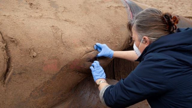 Elena Vecino empleó unos diez minutos para extraer el ojo de la ballena en el arenal de Sopela, y, sin embargo, tardó una hora en poder diseccionarlo con la ayuda de los miembros del grupo de investigación Oftalmo-Biología Experimental (GOBE) Noelia Rurafa, Xandra Pereiro y Miguel de la Fuente. “Fue una sorpresa. No nos esperábamos encontrar la masa cartílago-ósea protegiendo el globo ocular”, señala Elena Vecino. Es quizá esta una de las razones por las que el ojo pesa casi un kilo.