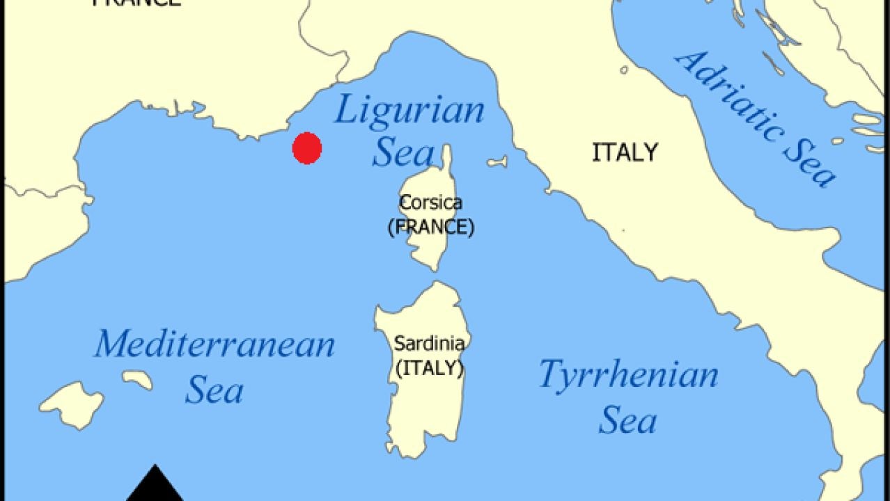 El estudio se ha desarrollado en el observatorio oceanográfico DYFAMED, en el mar de Liguria, zona del Mediterráneo situada entre la Riviera italiana y la isla de Córcega (Punto rojo en la imagen).