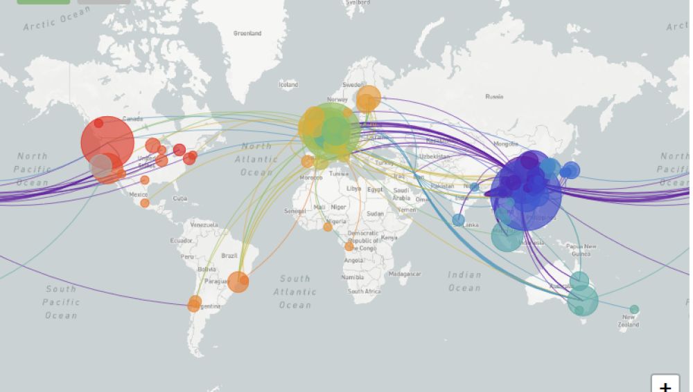 Nextstrain muestra —también gráficamente— el análisis de 512 genomas de pacientes de 33 países en cinco continentes, y la cifra crece día a día. Desde el pasado viernes España ya está en los mapas de Nextstrain de los movimientos del coronavirus, y no —desde luego— porque el virus no estuviera antes aquí, sino porque aún no había ninguna secuencia de pacientes españoles. Las primeras las ha incorporado el grupo de Fernando González, del Servicio de Secuenciación y Bioinformática y el grupo de investigación en Epidemiología Molecular de FISABIO, en Valencia.