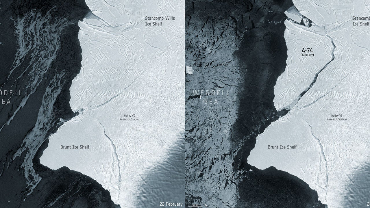 El pasado viernes, un iceberg gigante, de un tamaño aproximadamente dos veces al de la ciudad de Madrid, se desprendió de la sección norte de la plataforma de hielo Brunt de la Antártida. Esta tiene unos 150 m de espesor y se desliza hacia el mar de Weddell, al sur del océano Atlántico.