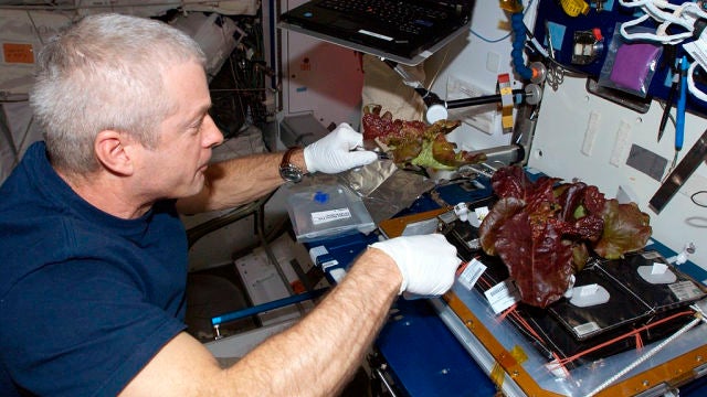Entre los años 2014 y 2016, la lechuga se cultivó a bordo de la ISS a partir de semillas esterilizadas en la superficie dentro de un sistema de producción vegetal llamado Veggie, que cuenta con cámaras de crecimiento equipadas con iluminación LED y un sistema de riego, diseñado específicamente para los cultivos en el espacio.