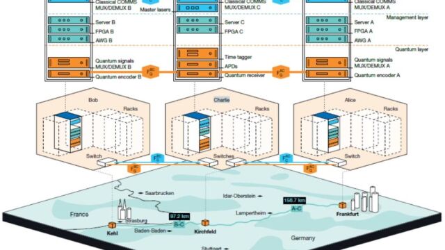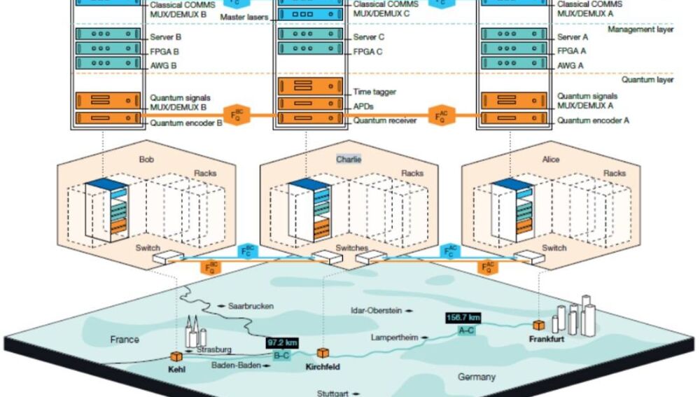 El estudio, publicado en la revista Nature, informa sobre la transmisión de mensajes cuánticos a través de una red de 254 km que conecta tres centros de datos entre Frankfurt, Kehl y Kirchfeld.