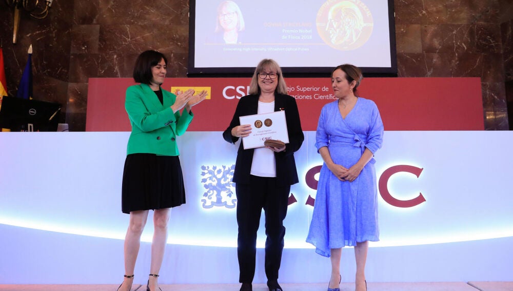 La Premio Nobel de Física en 2018, Donna Strickland (Guelph-Canadá, 1959), ha recibido hoy la Medalla de Oro del Consejo Superior de Investigaciones Científicas (CSIC), la máxima distinción que concede este organismo, "por sus descubrimientos en el campo de la óptica, que han supuesto un importantísimo avance, tanto desde el punto de vista conceptual como aplicado".