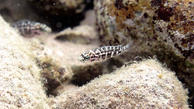 El lago Tanganica, el segundo más grande del mundo en volumen y el segundo más profundo, linda con cuatro países, pero es en su extremo sur, en Zambia, donde vive la especie Neolamprologus obscurus, unos pequeños peces de agua dulce con rayas que se alimentan sobre todo de gambas y otros invertebrados que encuentran en las profundidades.