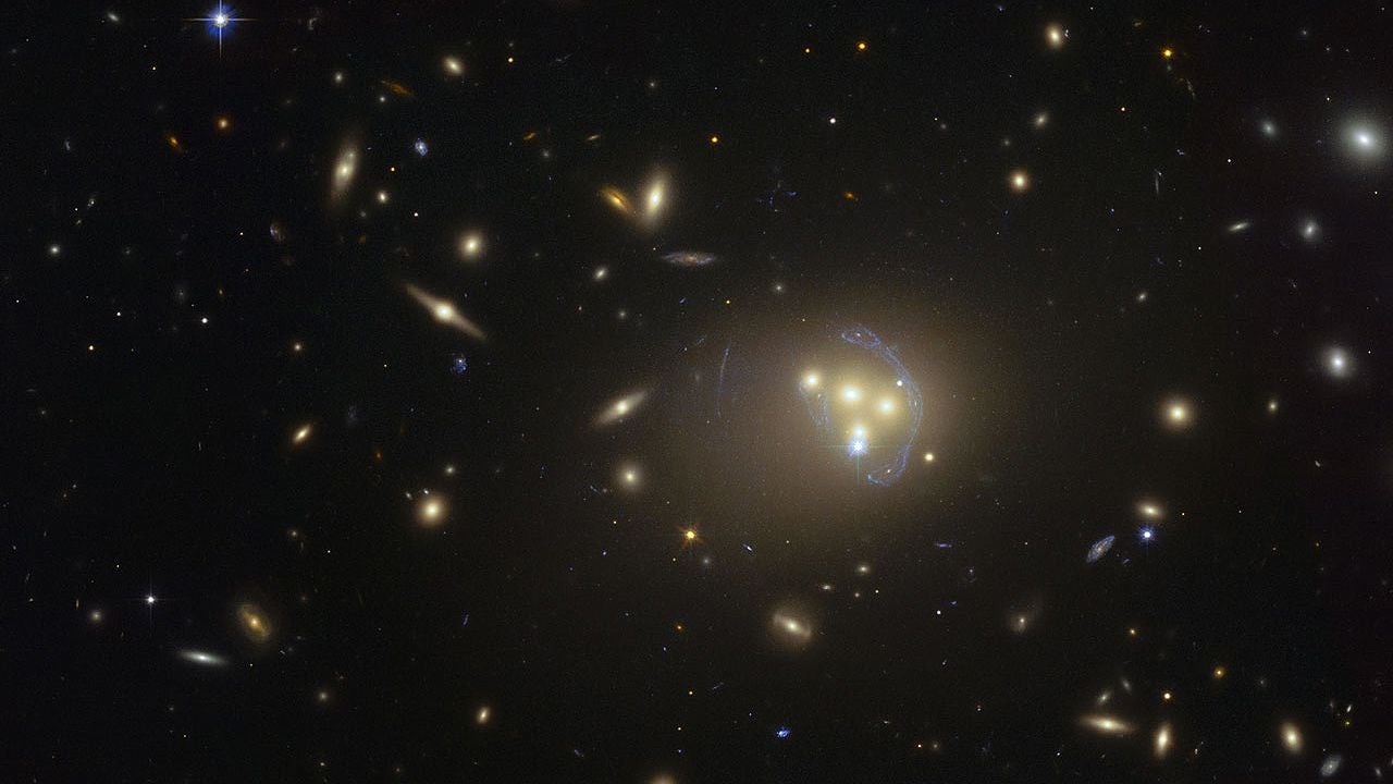 Un equipo de astrónomos ha estudiado la colisión simultánea de cuatro galaxias en el cúmulo de galaxias Abell 3827 con el instrumento MUSE, del telescopio VLT del Observatorio Europeo Austral (ESO, en Chile) y las imágenes del telescopio espacial Hubble (NASA/ESA). El equipo ha podido determinar en qué partes del interior del sistema se encuentra la masa y comparar la distribución de la materia oscura con las posiciones de las galaxias luminosas.