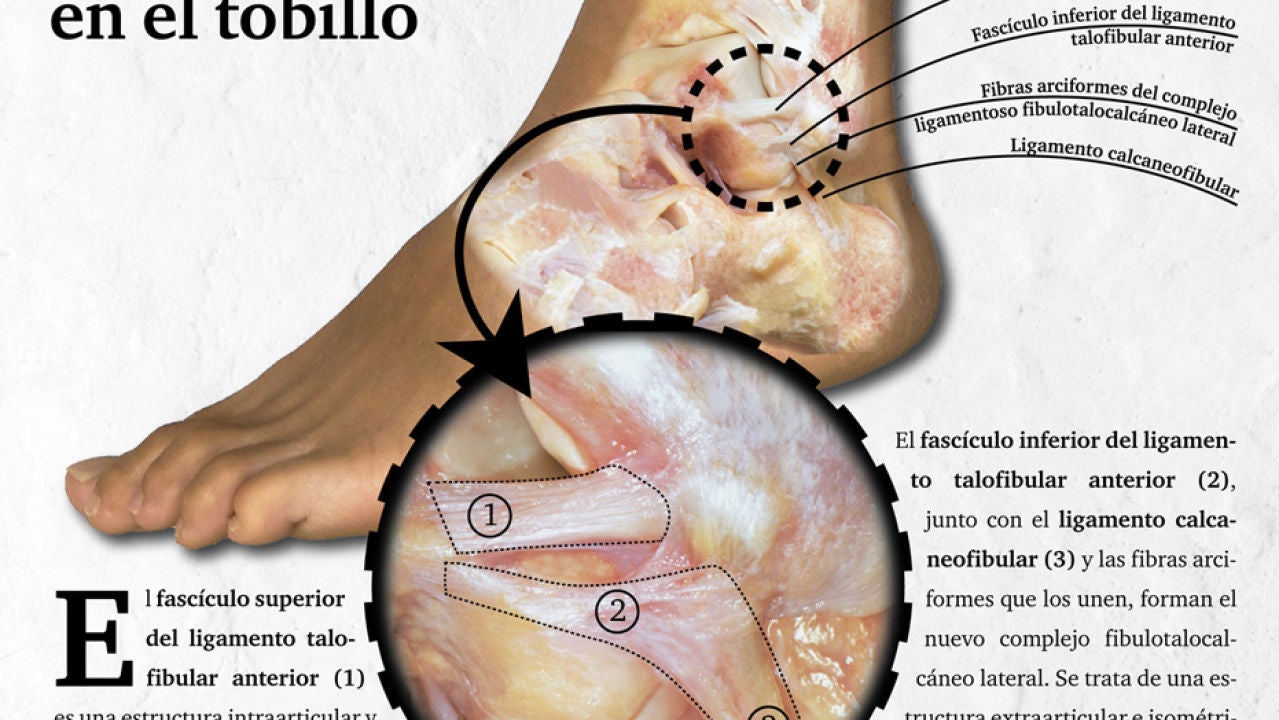 La disección cuidadosa de la cápsula articular del tobillo también ha permitido identificar por primera vez el componente intraarticular del ligamento talofibular anterior. Este ligamento estaría formado por dos fascículos, uno superior y uno inferior, que se encuentran respectivamente dentro y fuera de la articulación. El fascículo inferior, junto con el ligamento calcaneofibular y las fibras arciformes que los unen, formarían el complejo fibulotalocalcáneo lateral, que sería por tanto una estructura extraarticular.