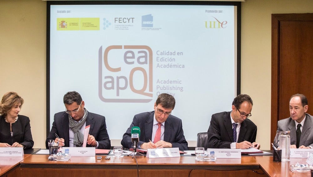 Ayer se firmó en Madrid un convenio entre la Agencia Nacional de Evaluación de la Calidad y Acreditación (ANECA), la Fundación Española para la Ciencia y la Tecnología (FECYT)y la Unión de Editoriales Universitarias Españolas (UNE) con el objetivo de lanzar un sello de calidad para colecciones científicas, publicadas por las editoriales universitarias españolas.