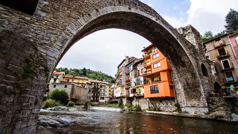 En la comarca del Ripollés, en la provincia de Girona, se encuentra Camprodón. En invierno es un destino ideal para los amantes del esquí. Pero también es el lugar donde nace el río Ter y eso puede disfrutarse todo el año. Además, entre sus principales atractivos también podemos nombrar su Puente Nuevo o su rica gastronomía de montaña.
