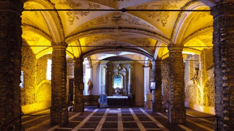 La de Evora es, sin duda, la más famosa de las tres Capillas de Huesos que os proponemos visitar; fue construida en el S.XVI por iniciativa de unos frailes franciscanos que querían mostrar de un modo gráfico la fragilidad de la existencia humana y la eternidad de su alma. Las paredes y pilares de esta capilla están revestidos por unas 5000 calaveras y miles de huesos procedentes de los cementerios de la ciudad, descubrirás incluso dos esqueletos enteros colgados en la pared, se trata, según cuenta la leyenda, de los restos de dos hombres (padre e hijo) que fueron maldecidos por una mujer (esposa de uno y madre del otro) en estos términos: ¡que la tierra de vuestras sepulturas no os destruya!.